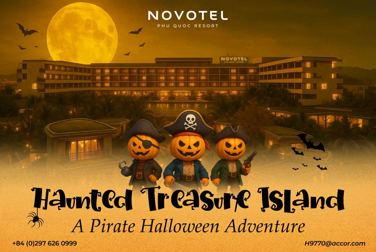The journey to uncover the cursed treasure on this tropical island will lead you through a hauntingly beautiful dining experience, mysterious decorations, and creative face painting inspired by Halloween legends – Novotel Phu Quoc Resort.